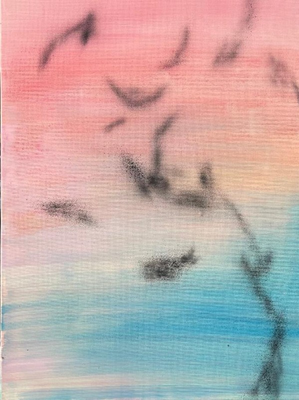 “Sopra Roma Termini”, Quadriptych “Starlings” acrylic on canvas, 60 × 80 cm, unframed The “Starlings” cycle is a visual meditation on collective movement, light and the silent rhythm of nature in dialogue with human space. The inspiration came from the article “The Unique Beauty of Flying Together” in National Geographic (October 2025), in which a flock of starlings creates changing, almost abstract formations over European cities. Ken Aabru (real name Ladislav Urbánek) translates the phenomenon of starlings flying in flocks into a subtly abstracted painting, in which the real becomes poetic and the concrete disappears into a colorful meditation. Each of the paintings bears a title in the language of the country where the inspired scene took place — from Roman rooftops to Dutch horizons. The artist works with acrylic in thin, translucent layers and with scattered traces of dark pigment that evoke the movement of birds. The color scale shifts from the pink and gold tones of evening light to the deep blue of the northern landscape. The result is a contemplative cycle in which calm and tension, matter and air, light and darkness meet in balance. “Starlings” is a visual diary of movement that cannot be stopped — of the fleeting moment when nature touches the geometry of the city and the landscape, and the world for a moment turns into a pure image.